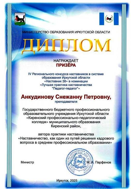 в системе образования Иркутской области «Наставник 38». Номинация: Лучшая практика наставничества «Педагог – педагог». Наименование практики наставничества: Наставничество, как один из путей решения кадрового вопроса в среднем профессиональном образовании (ГАУ ДПО Иркутской области «Институт развития образования Иркутской области») |